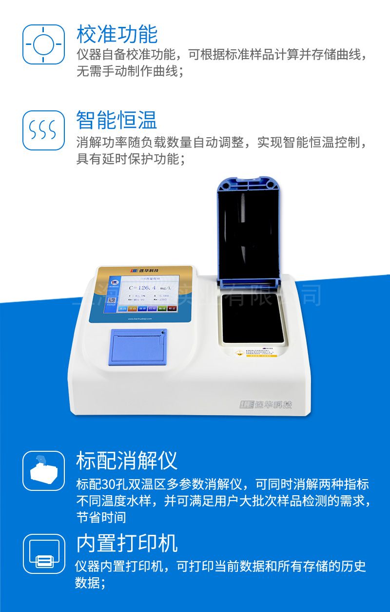 功能特点- 五十余项参数指标:直接测定化学需氧量(COD)、氨氮、总磷、总氮、悬浮物、色度(铂钴色系)、浊度、重金属、有机污染物和无机污染物等多项指标,浓度直读;